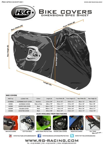 Theย *NEW*ย R&Gย Superbikeย Outdoor Cover has been redesigned to include many new features. Based off our original award winning design and made of quality waterproof material, the cover also features elasticated rim and Belly straps as standard ensure the cover stays fixed in place and stops wind, mud or water getting up inside the cover and ensure a tight fit around the base. Front and rear chain loops for security devices covered by a velcroยฎ closing flap to ensure the cover is fully waterproof and high-visibility reflective logos and trim piping for additional visibility at night. Suitable to fits on all modern supersports, sportsbikes and most dirt bikes and supermotos.