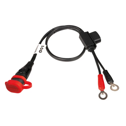 This is the latest version of the fused permanent connection lead – our most popular accessory. This SAE version of the fused eyelet lead is the same as those supplied with all current OptiMate chargers. It has a rubber cover for the 2-pin connector to keep the electrical connects dry and corrosion free. You can use additional leads to fit one to every vehicle which requires its battery to be charged – in this way one OptiMate can be used with several vehicles on a rotational basis very simply and quickly. Simply connect the 2 ring terminals to your battery and the 2-pin connector will always be available to connect your OptiMate to without having to delve into the vehicle.